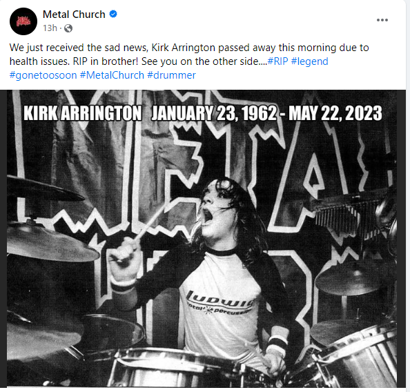 “We just received the sad news, Kirk Arrington passed away this morning due to health issues. RIP in brother! See you on the other side….#RIP #legend #gonetoosoon #MetalChurch #drummer”.