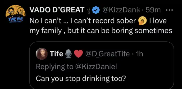 Addressing questions about his alcohol intake, the “Buga coroner” delved into the reasons behind his decision to forego alcohol while recording music. In a conversation with an online user, Kizz Daniel acknowledged the challenges of recording music while sober, hinting at the difficulties he faces in finding creative inspiration without the aid of alcohol.