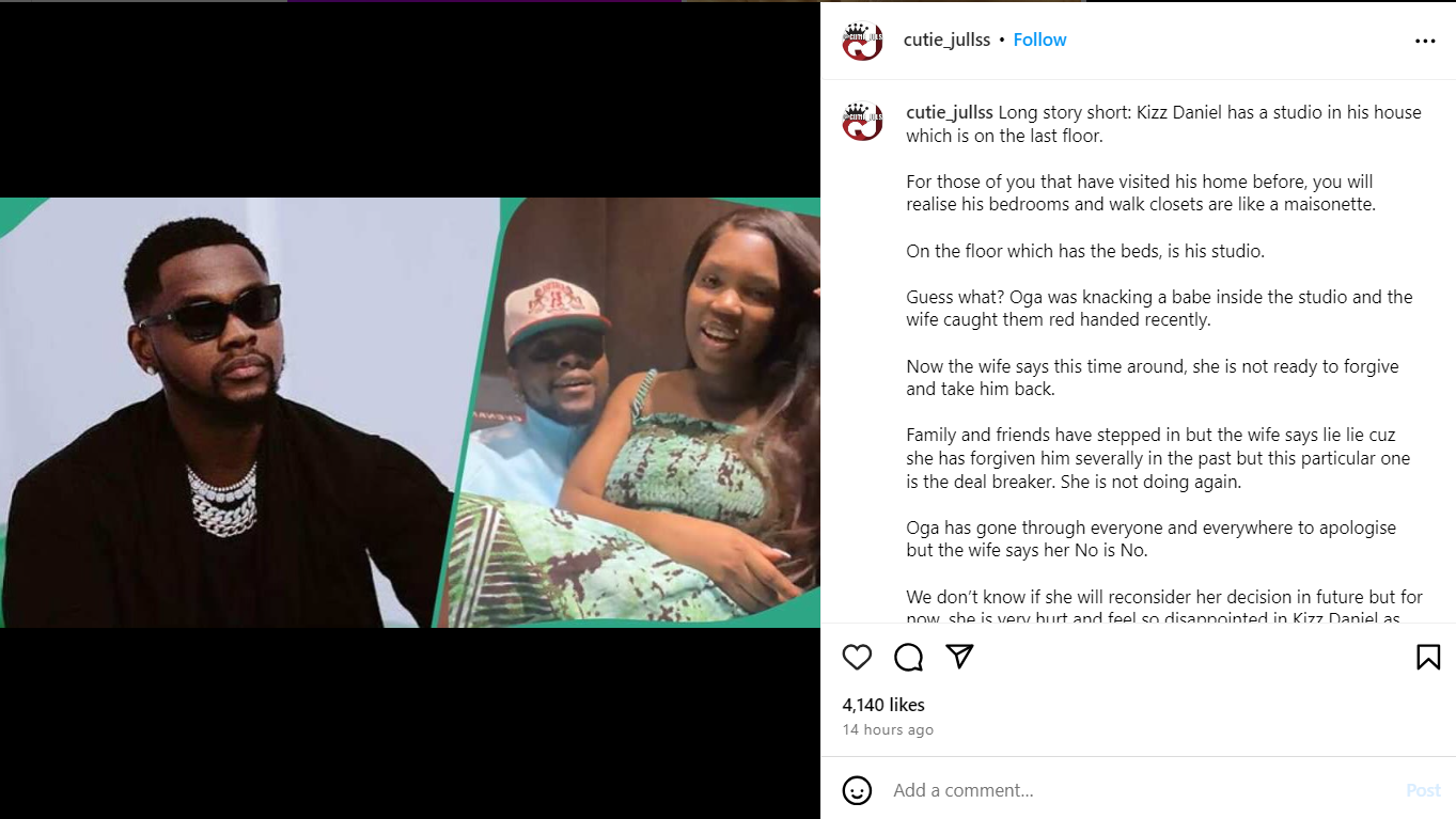 According to the blogger, MJay caught her husband being intimate with another woman in his home studio. Cutie Juls provided details about the incident, explaining that Kizz Daniel’s house has a studio on the top floor, near the bedrooms.