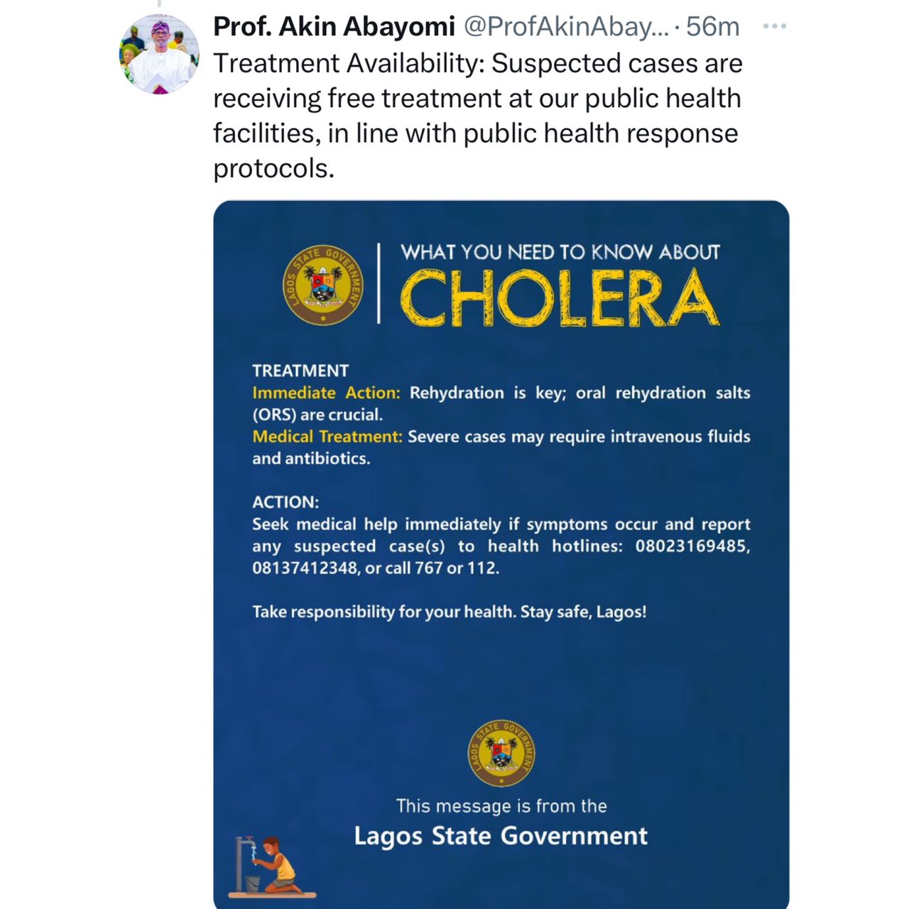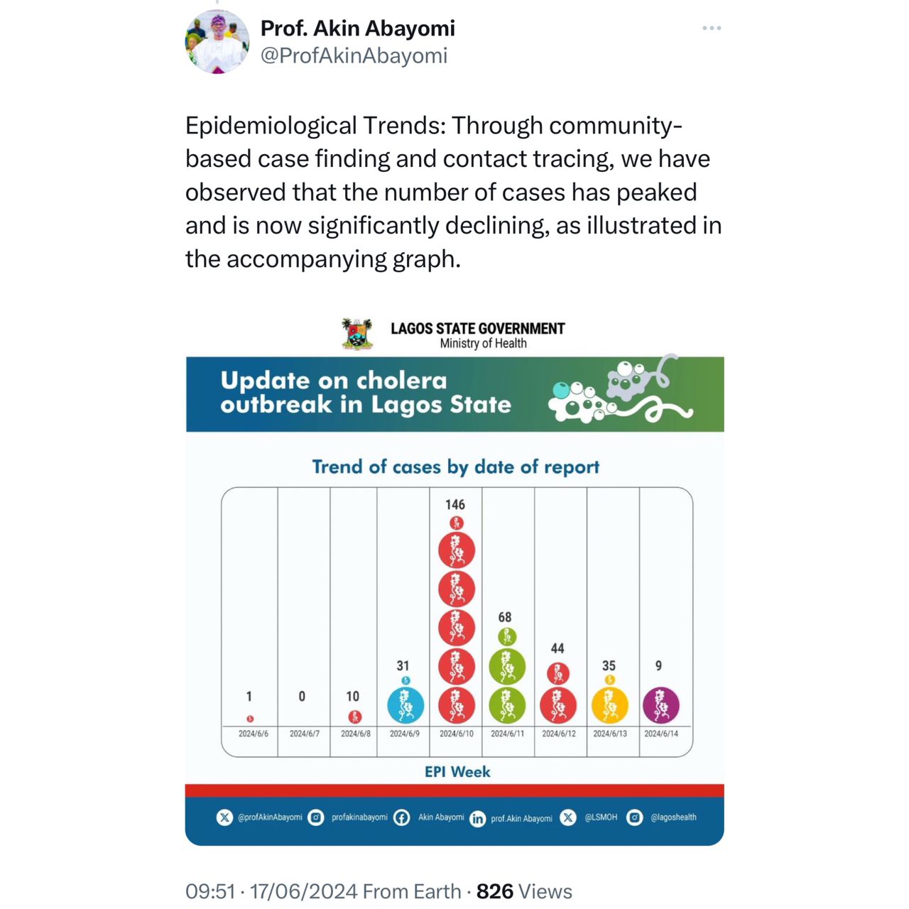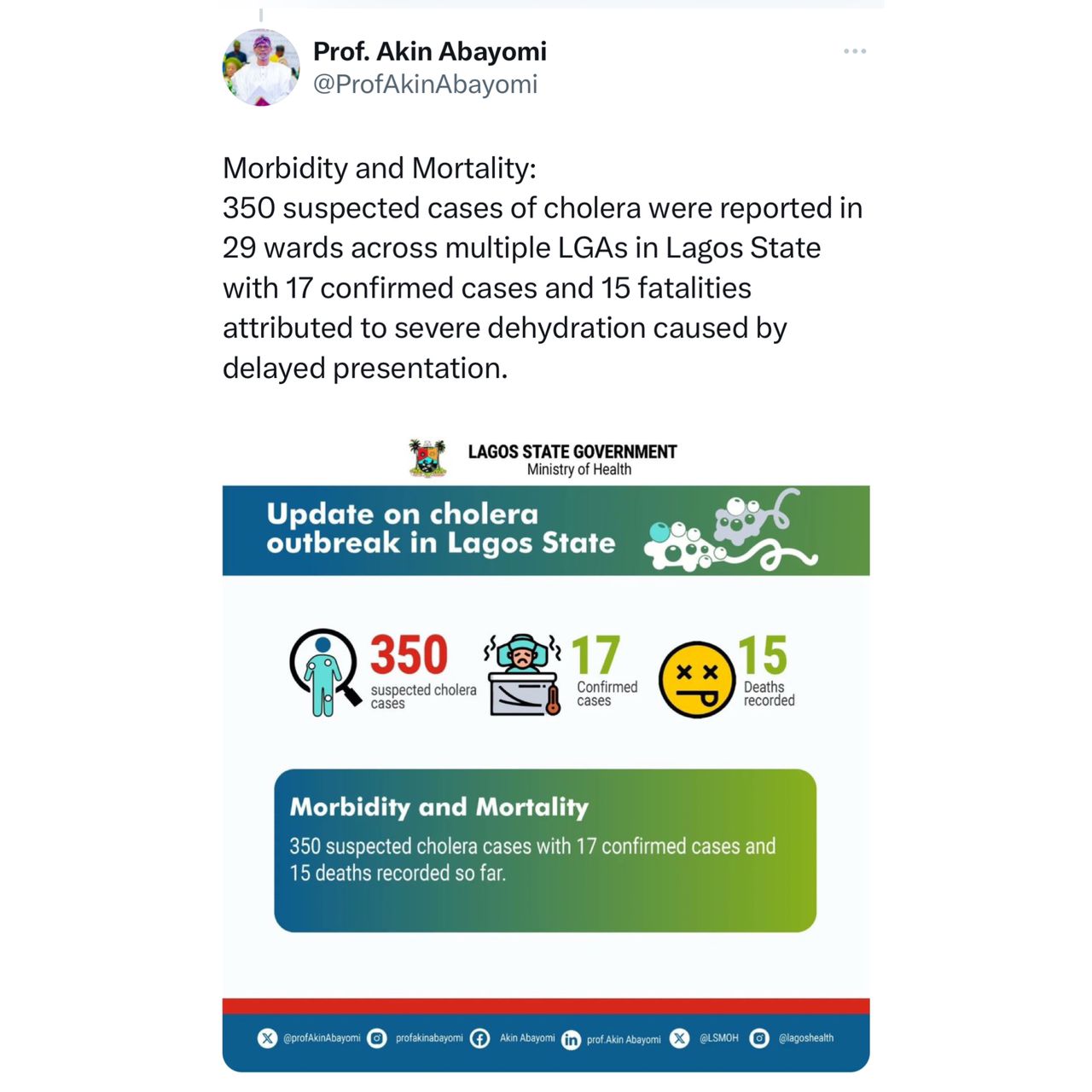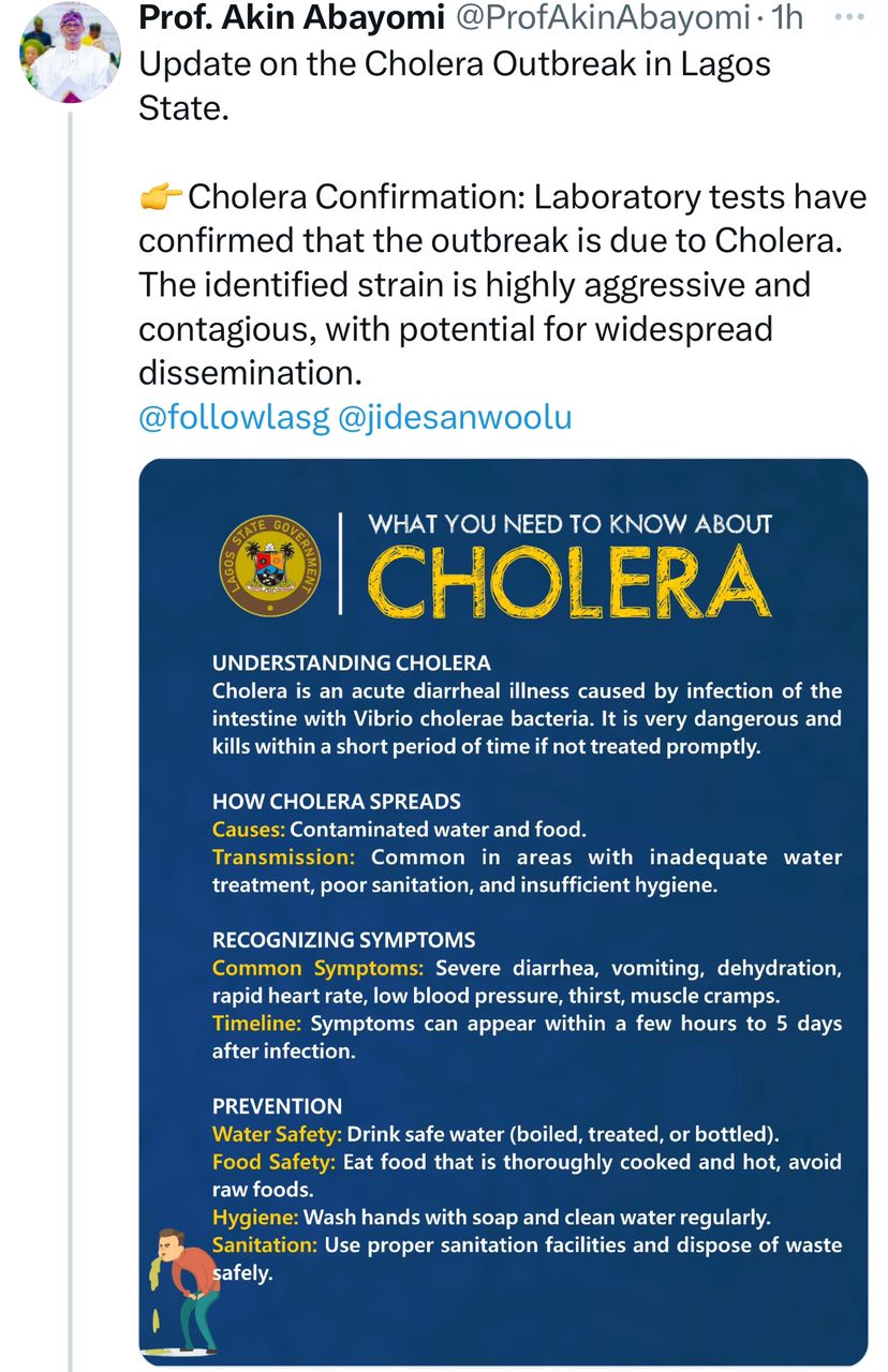 Lagos State Health Commissioner, Professor Akin Abayomi, has announced that the number of cholera cases in the state has significantly decreased. He made this announcement on his official social media handle on June 17.