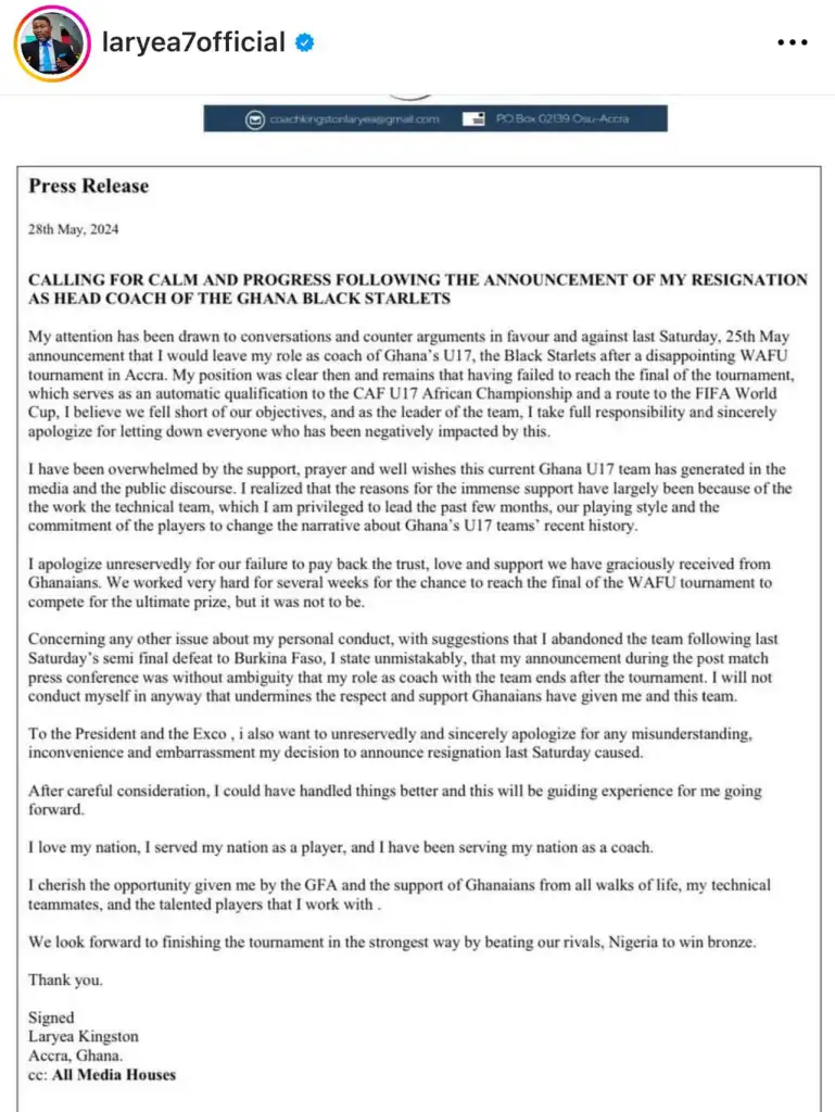 “I want to sincerely apologize to the people of Ghana for my actions and the timing of my resignation announcement,” Kingston said in a statement. “I understand the disappointment of not qualifying for the final, which was our primary objective. I take full responsibility for our shortcomings and am committed to seeing the tournament through to its end.”
