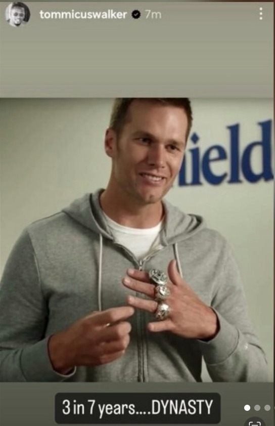Walker, an entrepreneur, shared a picture of NFL star Tom Brady wearing three Super Bowl rings on his Instagram Stories. He captioned the image with the words, “3 in 7 years…DYNASTY.”