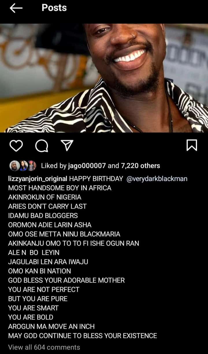 She wrote “HAPPY BIRTHDAY @verydarkblackman MOST HANDSOME BOY IN AFRICA