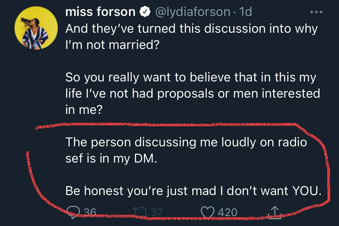 “And they’ve turned this discussion into why I’m not married? So you really want to believe that in this my life I’ve not had proposals or men interested in me? The person discussing me loudly on radio sef is in my DM. Be honest you’re just mad I don’t want YOU.”