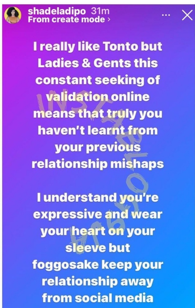 Shade Ladipo, therefore took to her Instagram page to send advice to Tonto, saying that, the actress seems to have not learned from the mishaps of her previous relationship. She said she understands that Tonto wears her heart on her sleeve but “for God’s sake, keep your relationship away from social media.”