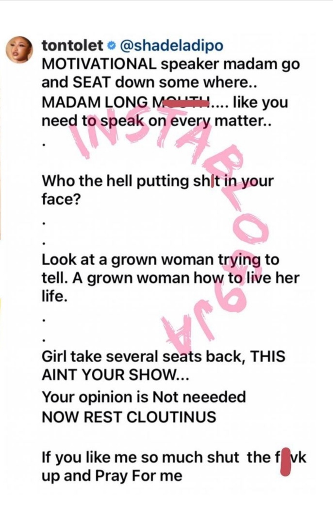 Shade’s unsolicited advice didn’t seem to sit well with Tonto and she responded, asking her to “go and sit down somewhere” as this is not her show and her opinion is not needed. She said, if Shade likes her so much as she stated in her post, she should rather “shut the fvk up” and pray for her instead of chasing clout with her matter.