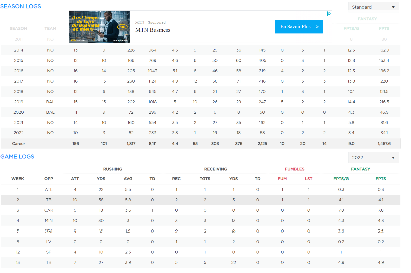 So far, he has played in 146 career games with 97 starts, carrying 1,755 times for 7,878 yards (4.5 avg.) with 64 touchdowns, while catching 287 passes for 2,057 yards with ten touchdowns.