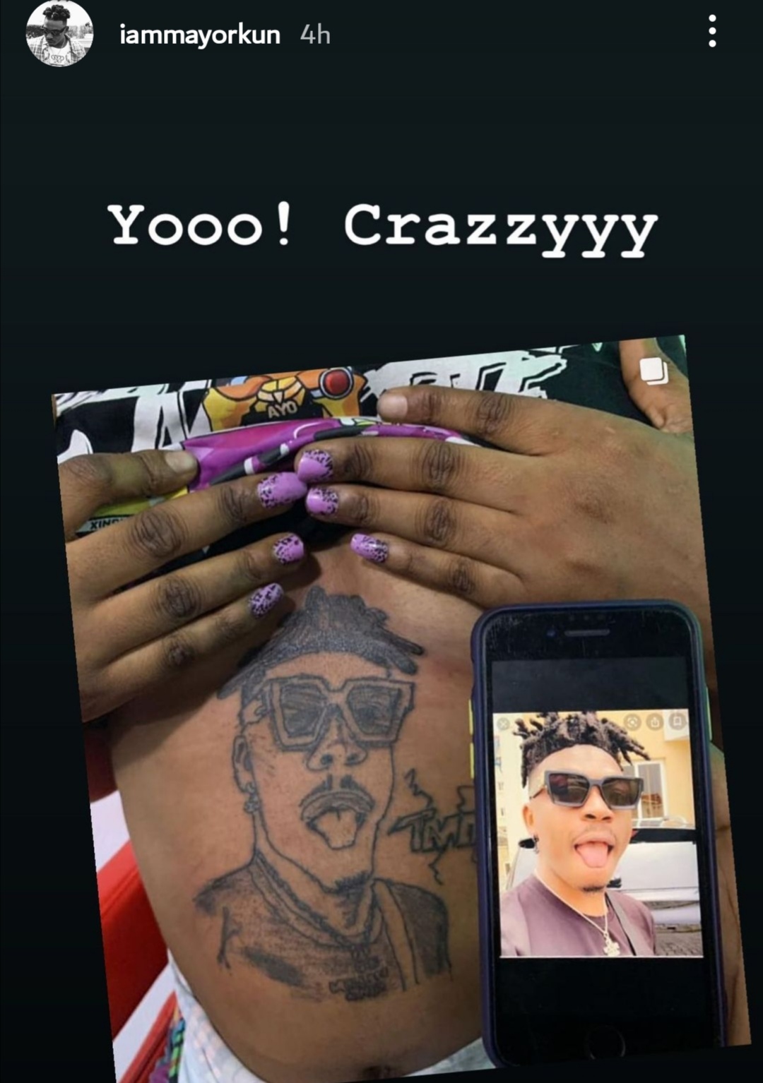 Nigerian singer, Mayorkun, has joined the league of celebrities whose fans have tattooed their faces on their bodies.
