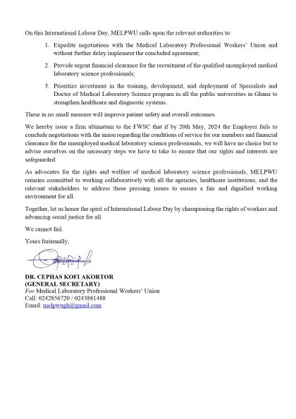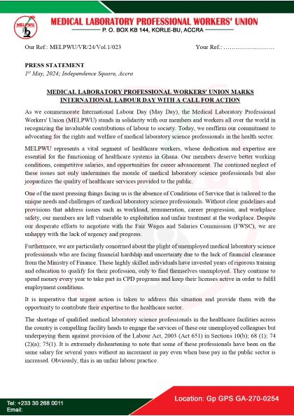In a press release issued on International Labour Day, MELPWU emphasized the critical role medical laboratory science professionals play in the healthcare system.