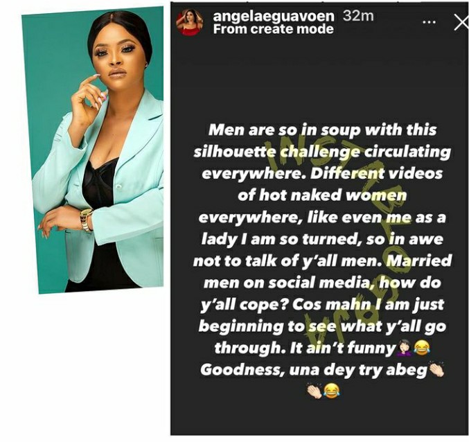 Angela Eguavoen has taken to social media to react to the Silhouette Challenge videos trending on various social media platforms by saying men are really trying to hold themselves.