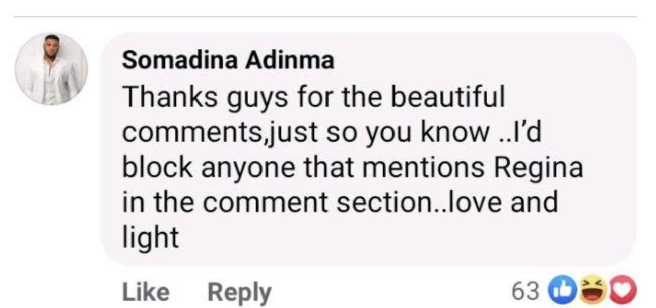 “Thanks, guys for the beautiful comments, just so you know….I’d block anyone that mentions Regina Daniels in the comment section…love and light.”