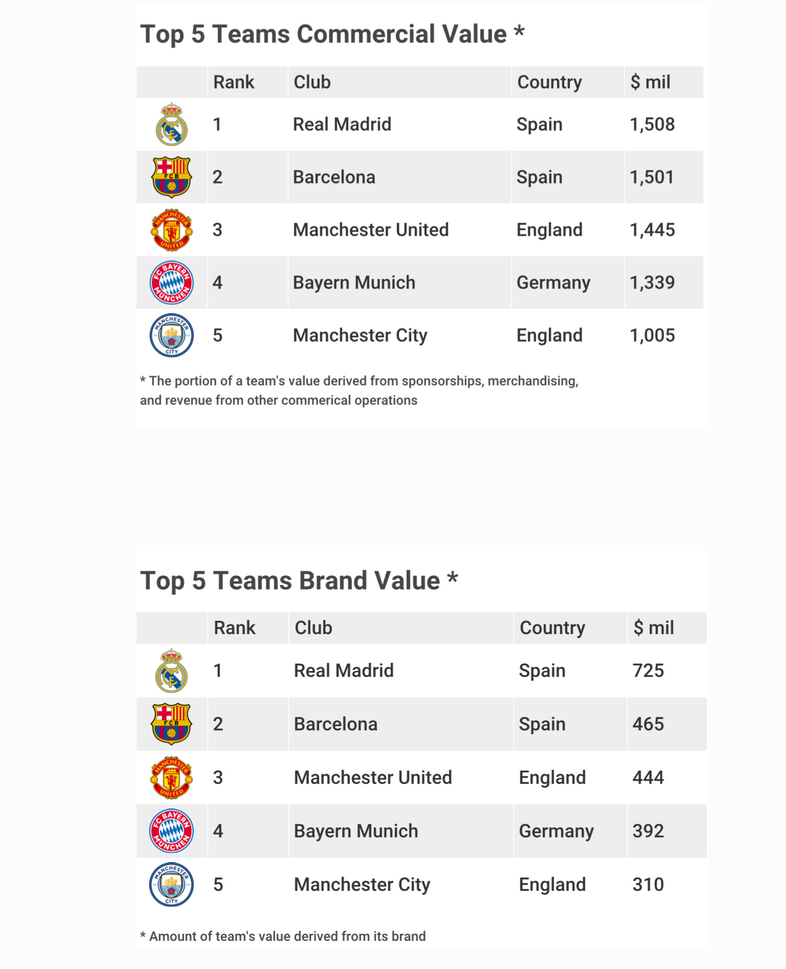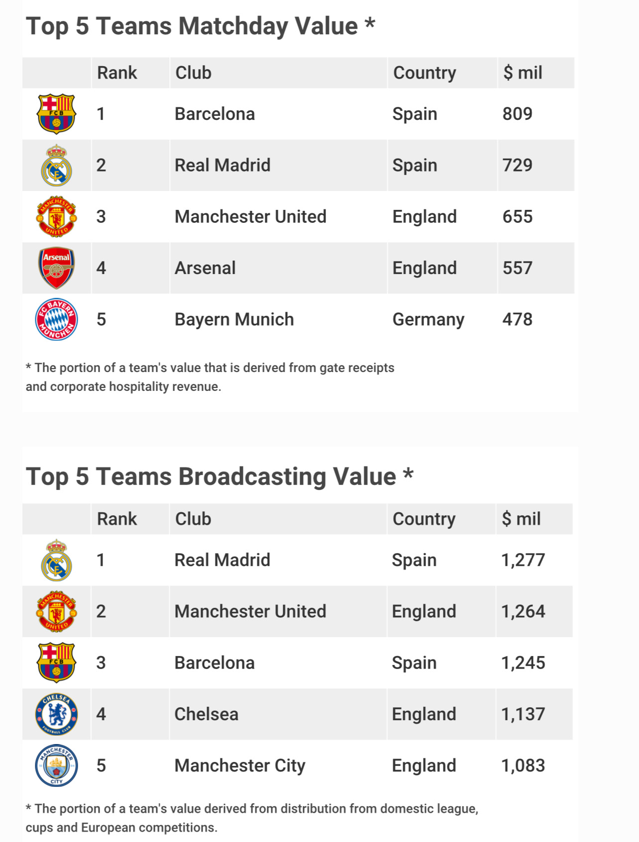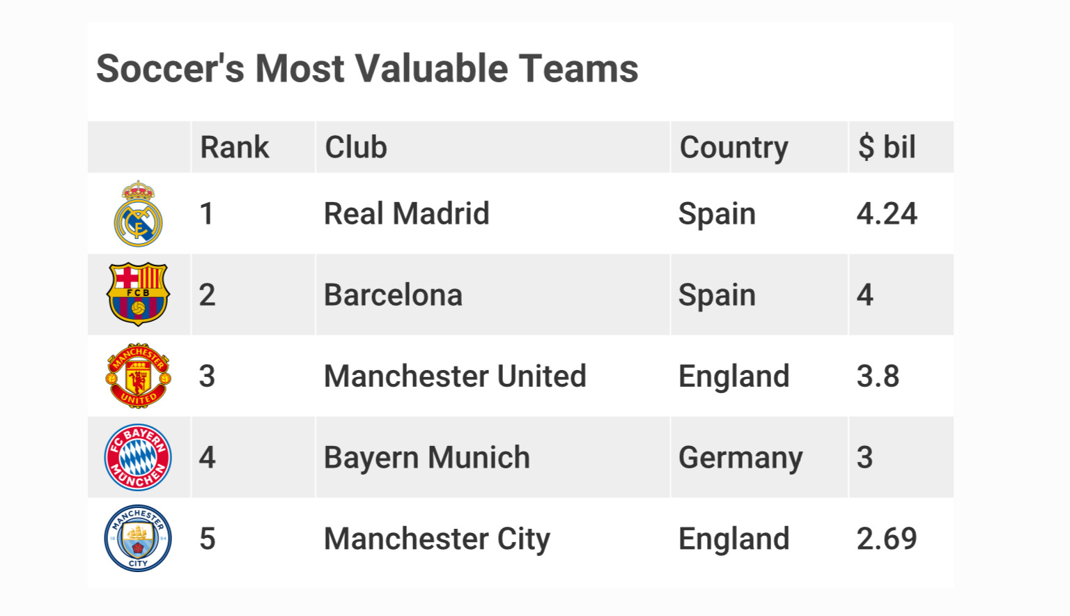 The top five most valuable clubs are Real Madrid Real $4.24 billion, Barcelona $4 billion, Manchester United $3.8 billion, Bayern Munich $3 billion and Manchester City $2.69 billion.