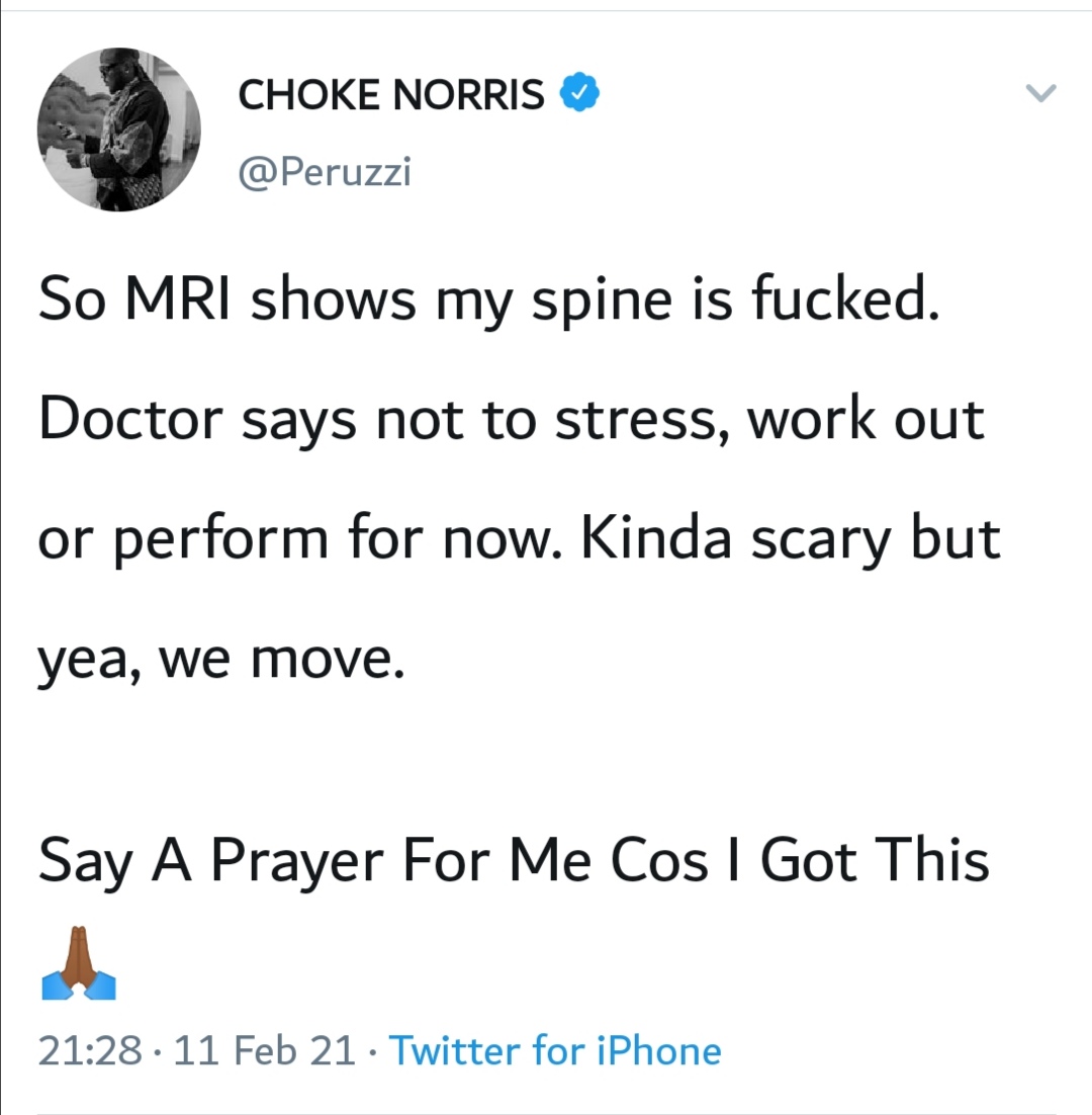 Peruzzi shared his current state of health with his followers via a tweet saying that he recently had an MRI scan and the results showed that, his spinal cord is not in good shape.