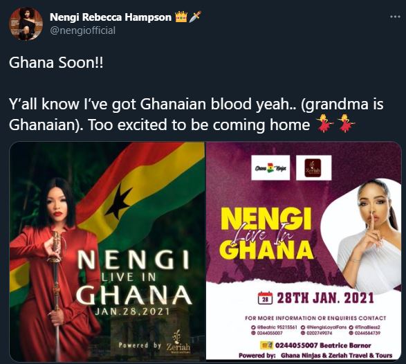 She tweeted, “Ghana soon!! Y’all know I’ve got Ghanaian blood yeah..(grandma is Ghanaian). Too excited to be coming home”.