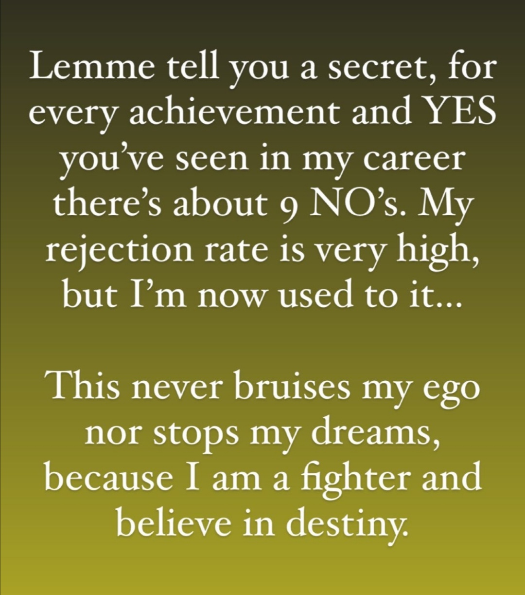 She said, is used to rejection as her “rejection rate is very highh” but she, however, has never let it bruise her ego or stop her from still chasing her dreams because she is a ‘fighter’ and believes in destiny.