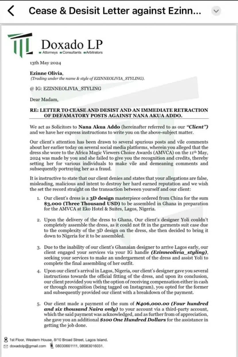 Nana Akua Addo has responded to claims made by Ezinne regarding the outfit she wore to the AMVCA, serving Ezinne with a cease and desist letter through her lawyers.