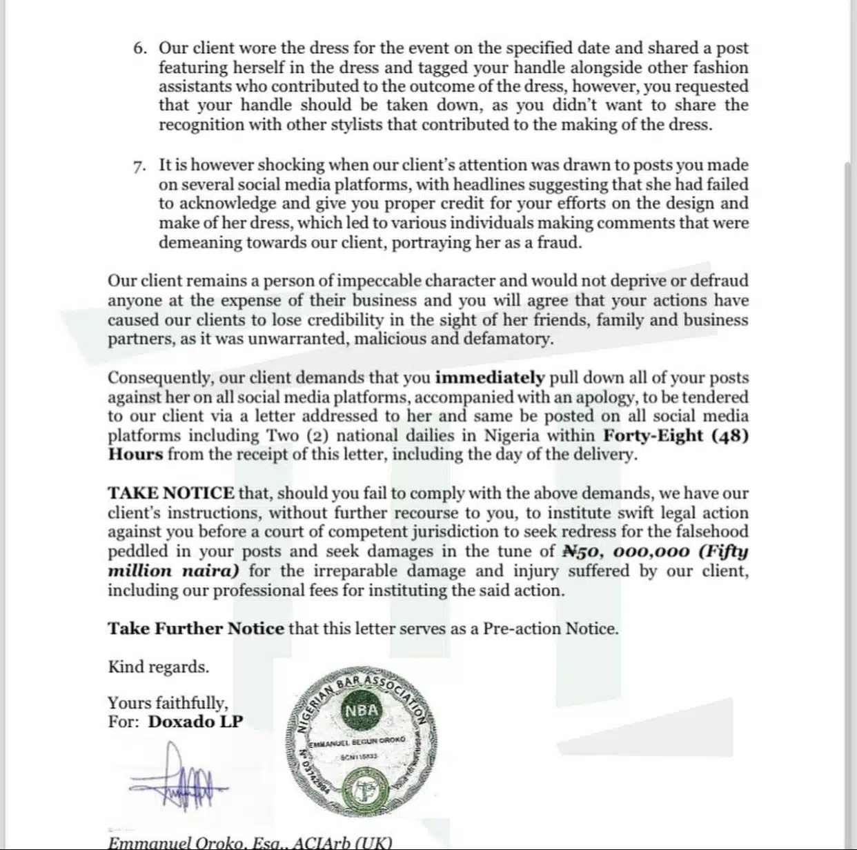 However, according to the cease and desist letter, Ezinne was initially tagged in the post but requested to have her name removed because she did not want to share the credit with others.