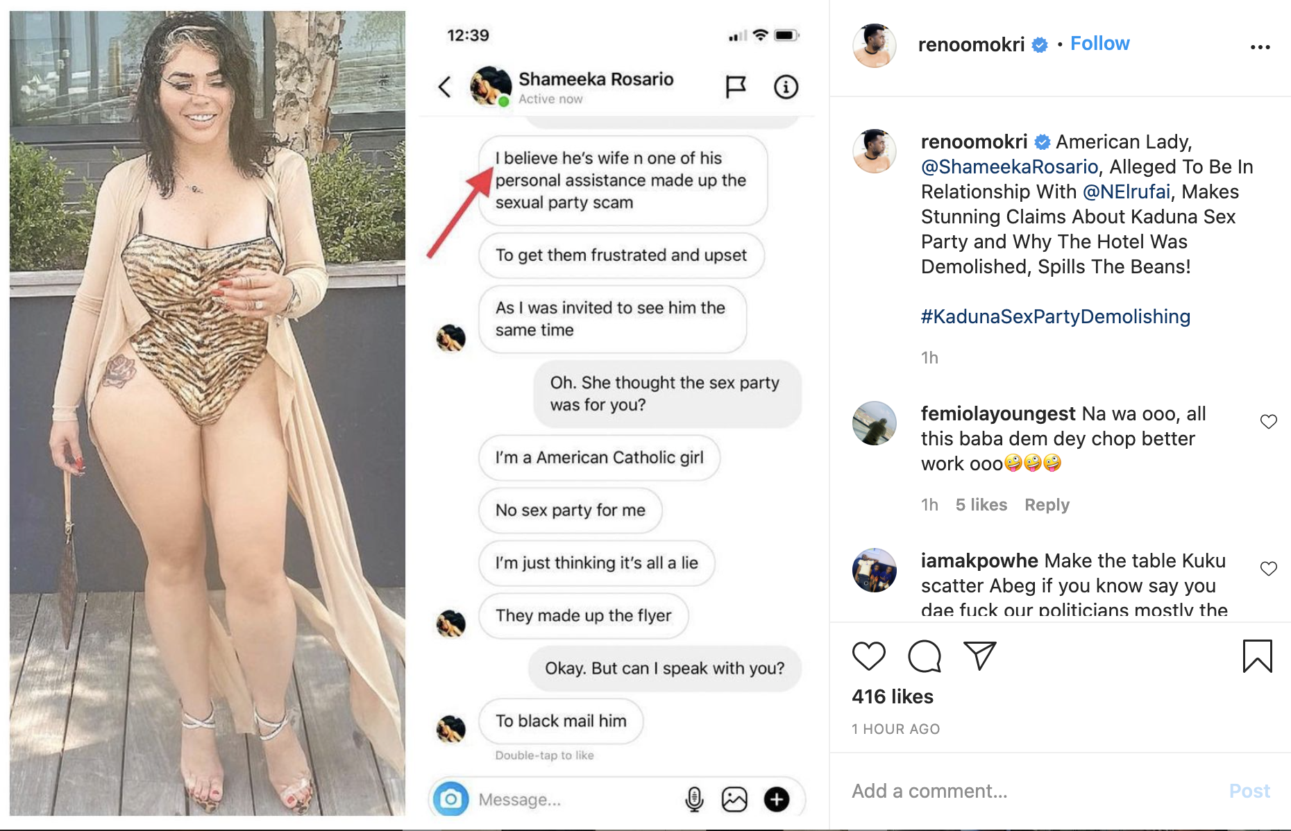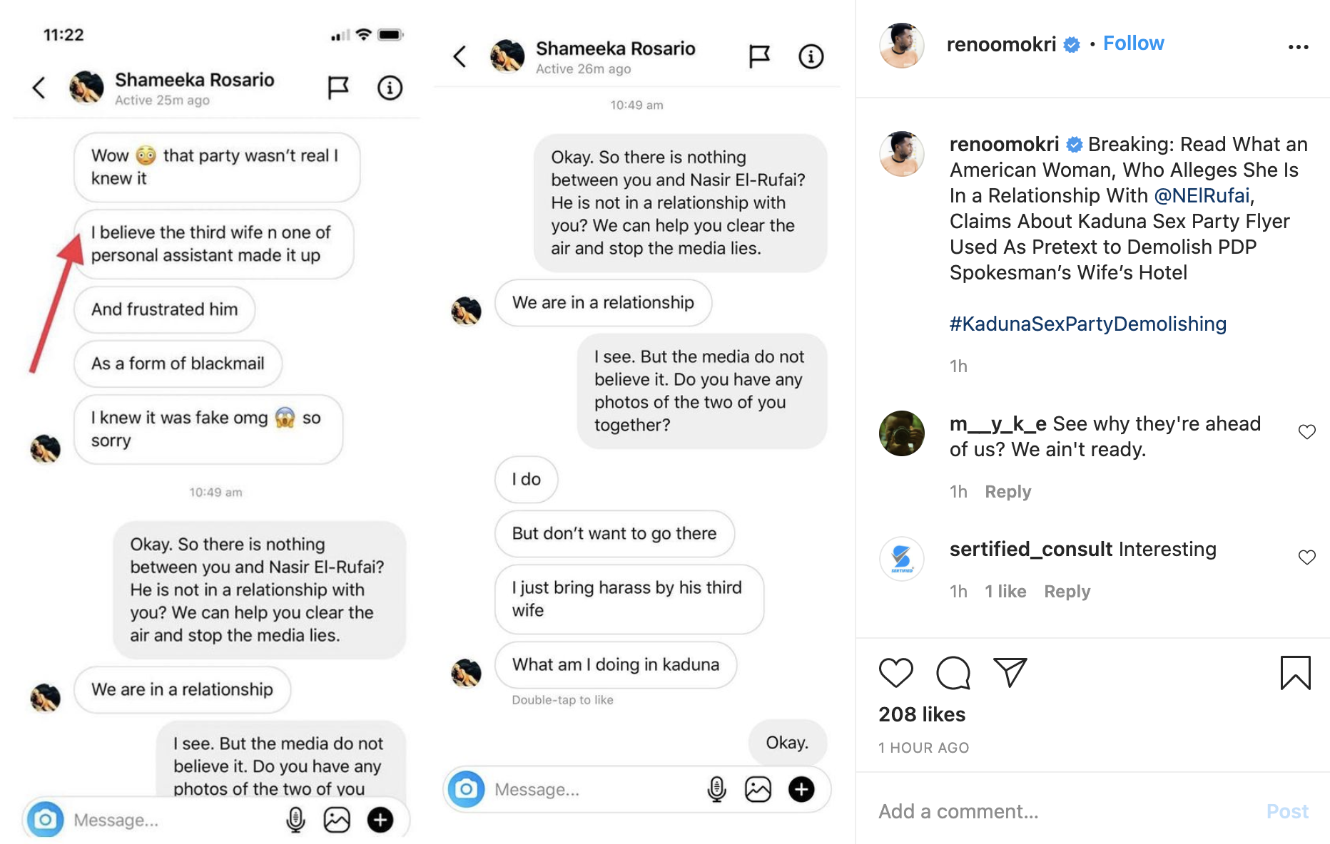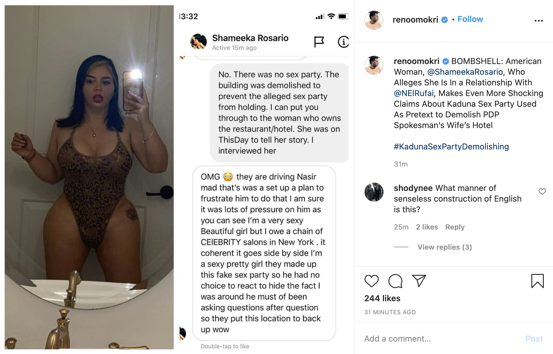 Reno Omokri has released screenshots of his conversations with Shameeka Rosario, the side chick of the state governor of Kaduna state, El Rufai, regarding the demolishing of the hotel.