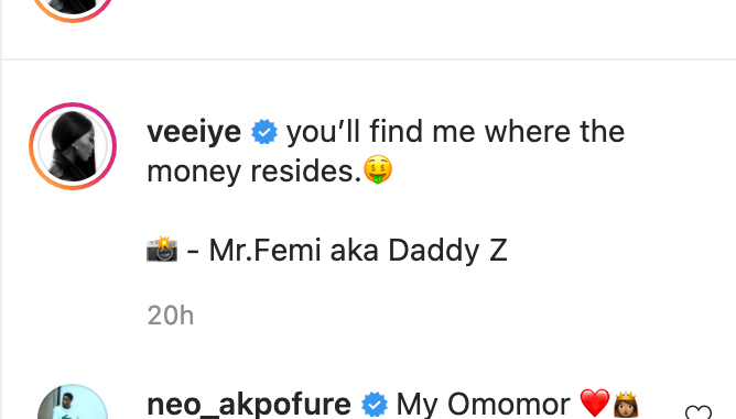 Vee was seen in a black outfit as she smiled to pose for pictures. Sharing these photos on her Instagram page, she attached the caption, “you’ll find me where the money resides. – Mr Femi aka Daddy Z”.