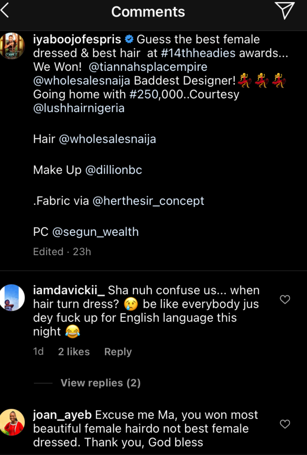 ”Guess the best female dressed & best hair at #14thheadies awards… We Won! @tiannahsplacempire @wholesalesnaija Baddest Designer!????????????Going home with #250,000”.