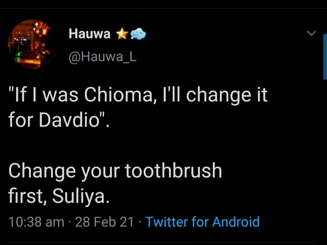 The two netizens that has advised Chioma to leave Davido, one identified as @JideO17 suggested appears disgusting. He claims Chioma should get rid of their child so she can move on. However, Huawa has suggested that as Chioma changes her toothbrush so must she change Davido.