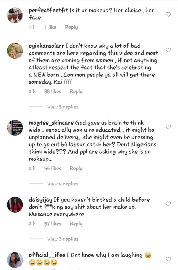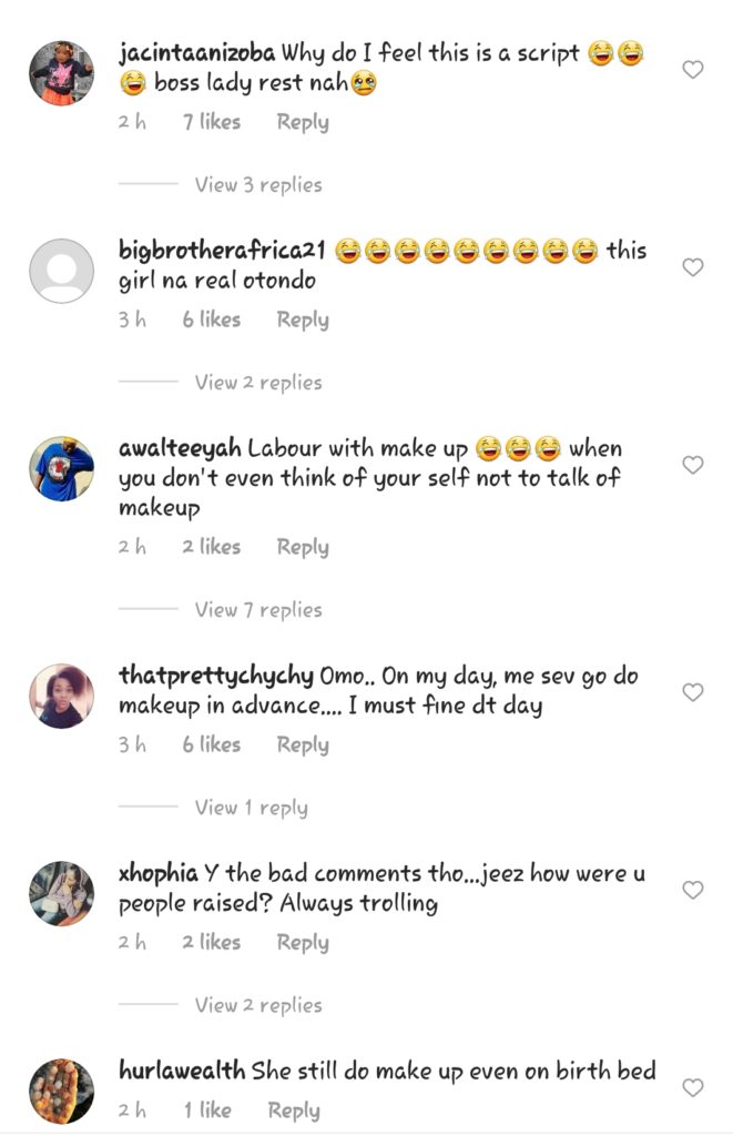 Reacting to the video, a fan identified as ‘awalteeyah’ took to the comment section and said, “Labour with makeup when you don’t even think of your self not to talk of makeup”.