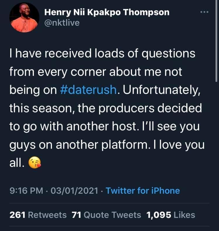 “I have received loads of questions from every corner about me not being on #daterush. Unfortunately, this season, the producers decided to go with another host. I’ll see you guys on another platform. I love you all.”