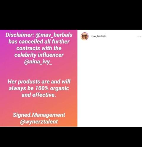 “Disclaimer: @mav_herbals has cancelled all further contacts with the celebrity influencer @nina_ivy. Her products are and will always be 100% organic and effective. Signed: Management @wynerztalent”.