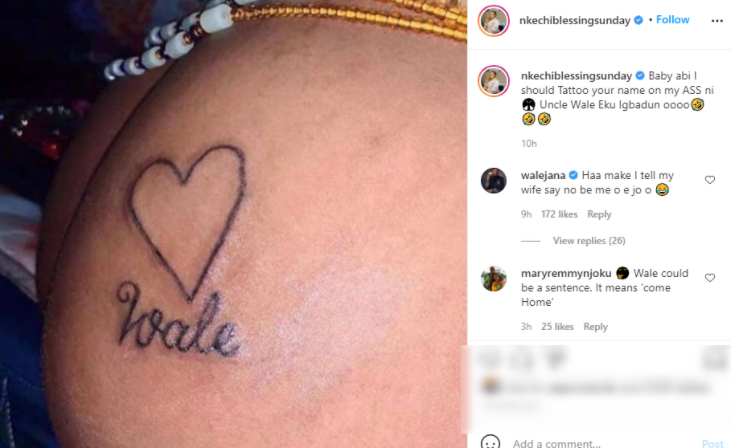 Sharing the photo, the actress wrote; “Baby abi I should Tattoo your name on my ASS ni… Uncle Wale Eku Igbadun oooo