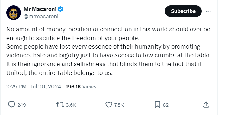Mr. Macaroni used his official X account on July 31, 2024, to express his views against exploiting societal issues for individual benefit. He shared that no amount of money, position, or connections should be enough to sacrifice the freedom of one’s people.
