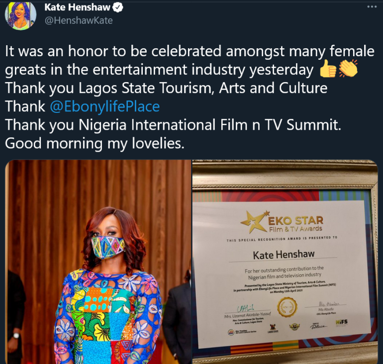 “It was an honor to be celebrated amongst many female greats in the entertainment industry yesterday. Thank you Lagos State Tourism, Art and Culture. Thank you Nigeria International Film n TV Summit…”.