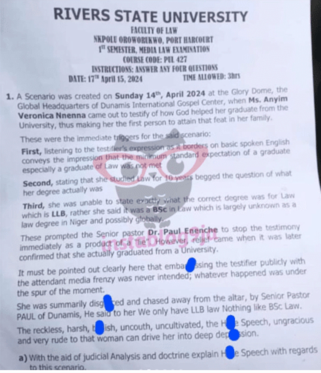 Netizens are buzzing with reactions as the clash between Pastor Paul Enenche and church member Veronica Anyim takes center stage in a law exam at River State University.