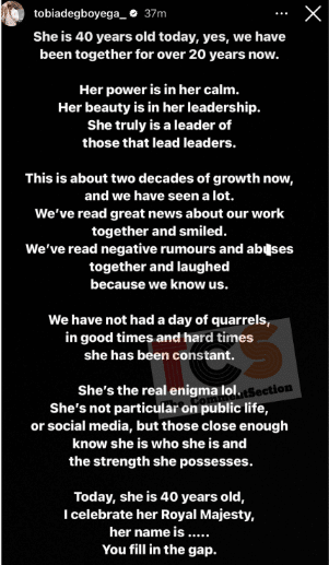Renowned Pastor Tobi Adegboyega from the UK, pays tribute to his wife on her 40th birthday with a heartfelt message. He reflects on their close bond that has strengthened over the years since their marriage.