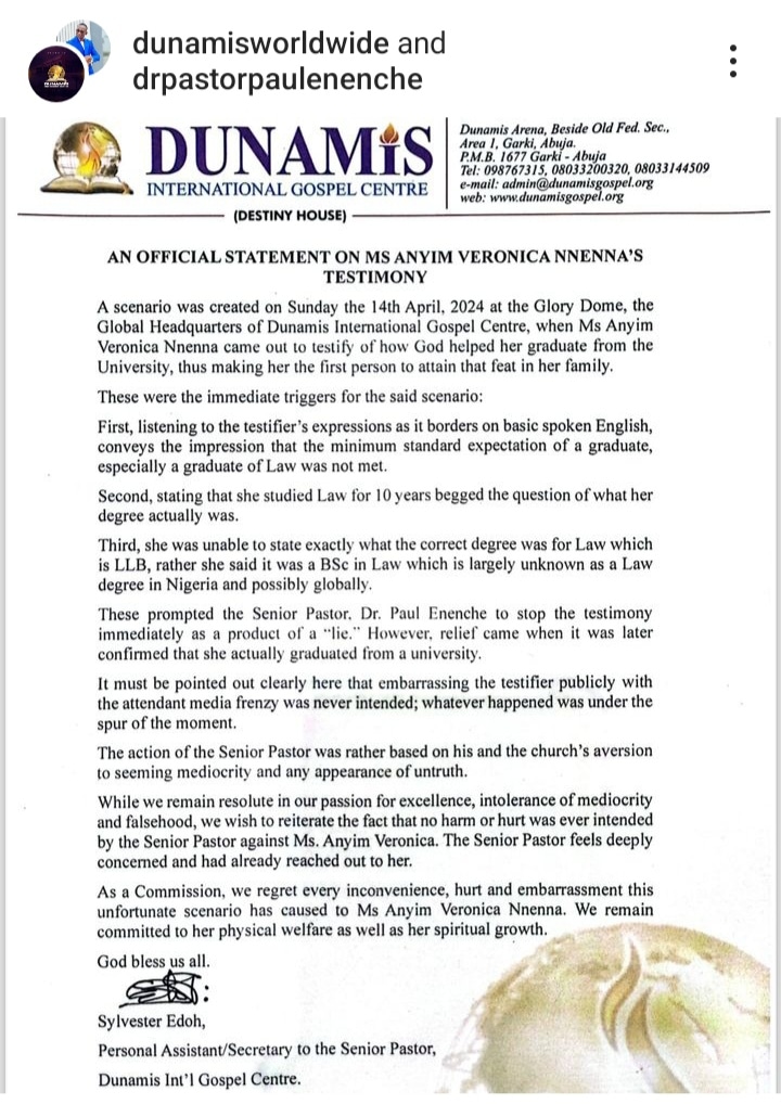 Dunamis International Gospel Centre has found itself in the spotlight following the public reaction of its senior pastor, Pastor Paul Enenche, to a testimony given by a member, Anyim Veronica.