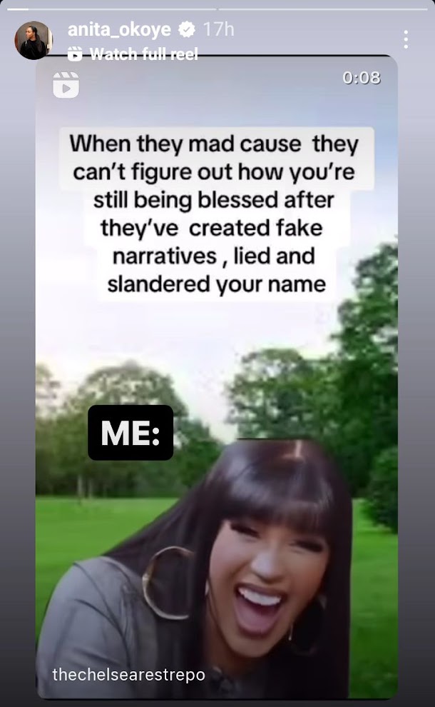 In her story, Anita shared a video of someone laughing, accompanied by a caption expressing her feelings about how people react when they can’t understand why she continues to prosper despite their efforts to spread false stories and damage her reputation.