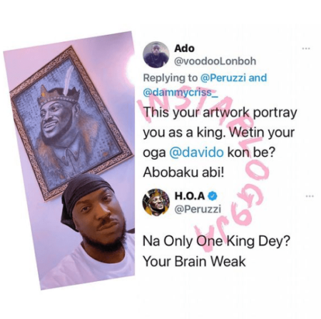 Peruzzi, who recently revealed that he didn’t feature on Davido’s album because his fee was expensive, responding to the troll insulted him, by telling him his brain is weak because there is only one king, and that is the American-born Nigerian singer, songwriter, contemporary artist, and record producer, Davido.