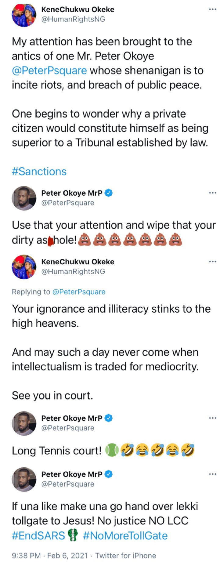 A member of the defunct singing group, PSquare, Singer Peter Okoye and human rights activist, Kenechukwu Okeke, has clashed on Twitter today February 7, 2021, over the reopening of the Lekki toll gate.