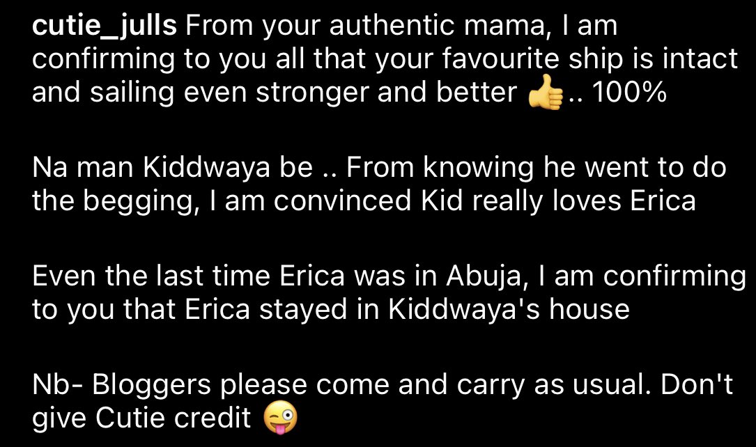 According to Cutie Julls, Kiddwaya went to Erica for forgiveness and the boss lady accepted his plea to return to him. She confirms that the last time Erica visited Abuja, she was sheltered in Kiddwaya’s house.