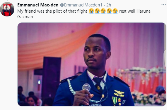 The identity of the pilot has been revealed. No life was survived and the number of people who were board has not been confirmed. The aircraft was identified as Nigerian Air Force Beechcraft KingAir B350i. One Twitter user by name, Emanuel Mac-den has taken to Twitter to reveal the identity of the pilot.