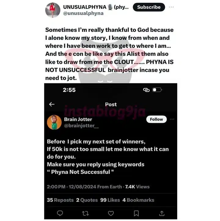 The situation escalated when a fake account, impersonating the popular skit maker Brain Jotter, created a “Phyna Not Successful” account and used it to conduct a giveaway.