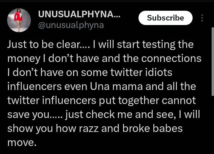 She wrote, “Just to be clear…. I will start testing the money I don’t have and the connections I don’t have on some twitter idiots influencers even Una mama and all the twitter influencers put together cannot save you….. just check me and see, I will show you how razz and broke babes move.”