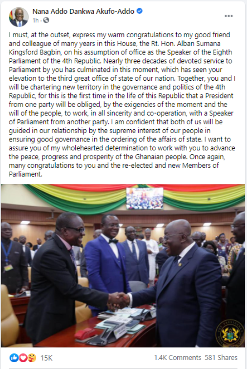 President Akufo-Addo posted a picture of himself in a handshake with Alban Bagbin and wrote;