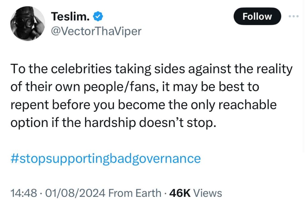 In a powerful message shared on his X handle, Vector criticized celebrities who take sides against the realities faced by their own people. He urged them to stop supporting bad governance and to use their platforms to amplify the voices of the masses.