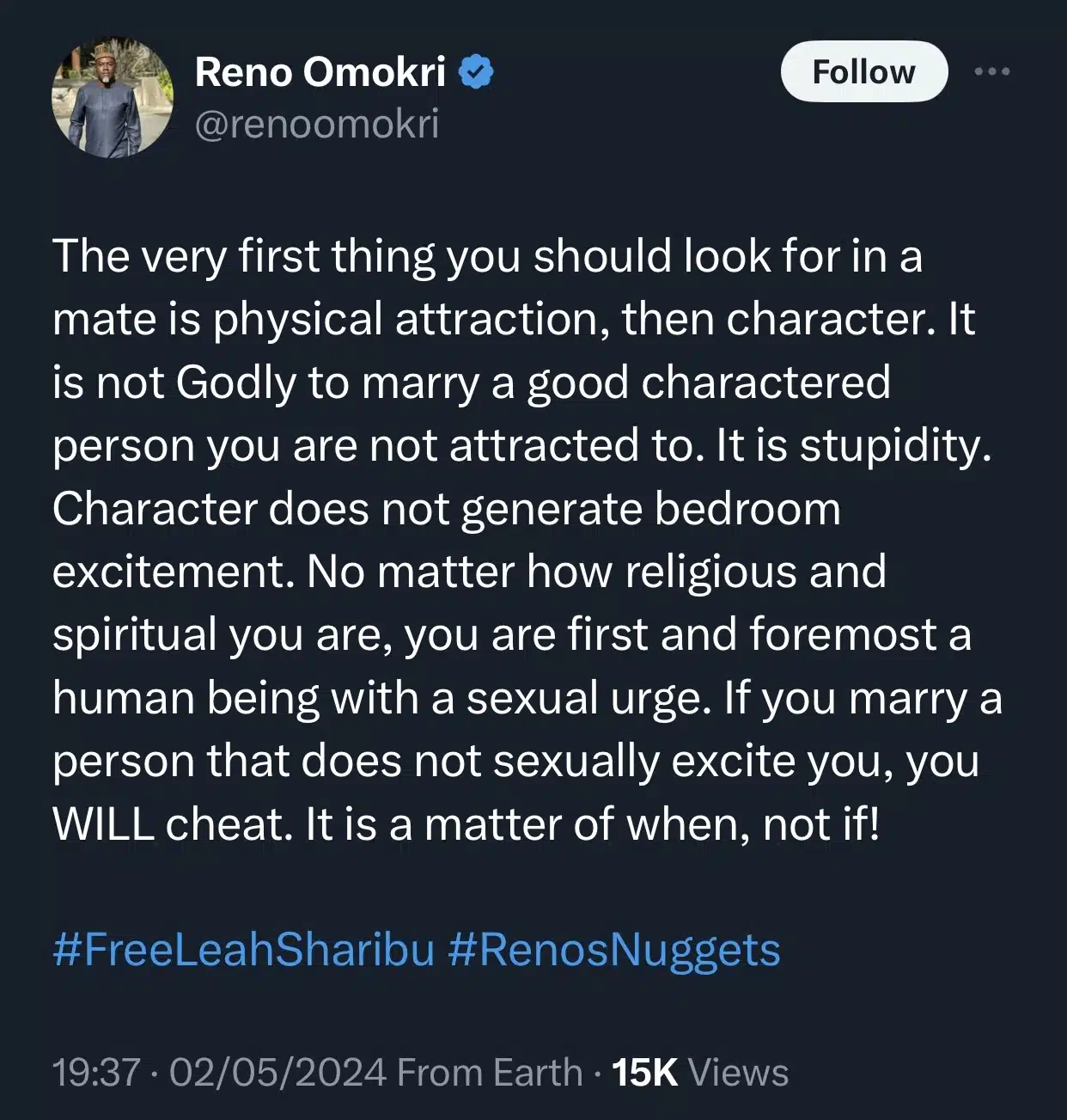 In a recent tweet, he cautioned against tying the knot solely based on a partner’s good character, without considering physical attraction.