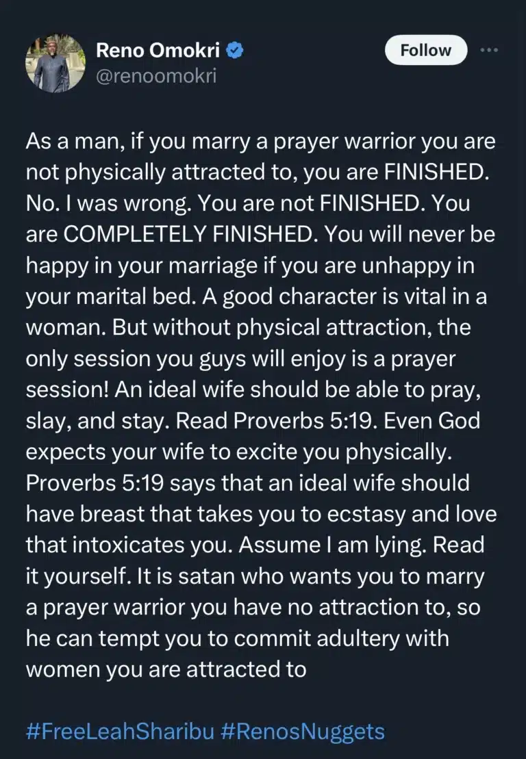 Drawing from biblical wisdom, Omokri emphasizes that God’s design for marriage involves more than just character compatibility. He contends that a man should be drawn to his wife both emotionally and physically. In other words, a healthy marriage requires a balance between inner virtues and external allure.