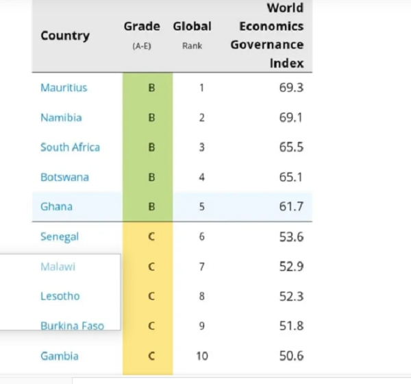 According to data published on World Economics’ website, Mauritius claimed the top spot in Africa with a grade of B and an index score of 69.3, closely followed by Namibia in 2nd place with an index of 69.1. South Africa and Botswana secured the 3rd and 4th positions respectively, preceding Ghana in the rankings.