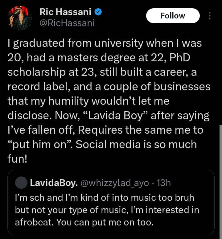 The singer’s remarks come in response to an interaction with an online user, @whizzylad_ayo, who suggested that Ric Hassani had lost relevance and sought exposure in the Afrobeat industry.