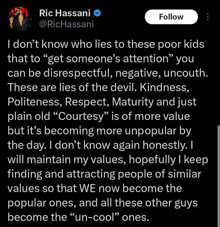 He wrote: “I don’t know who lies to these poor kids that to “get someone’s attention” you can be disrespectful, negative, uncouth. These are lies of the devil. Kindness, Politeness, Respect, Maturity and just plain old “Courtesy” is of more value but it’s becoming more unpopular by the day. I don’t know again honestly. I will maintain my values, hopefully I keep finding and attracting people of similar values so that WE now become the popular ones, and all these other guys become the “un-cool” ones.”