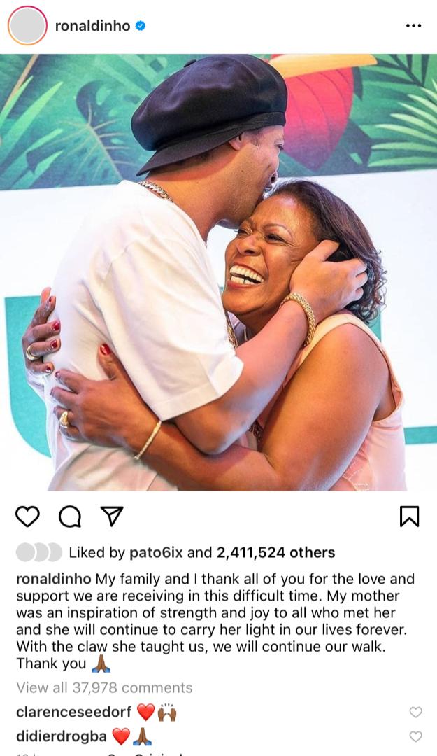Ronaldinho in a post shared via his social media account thanked fans and friends for their show of support following the news of his mother’s death. The football legend on behalf of his family acknowledged the consent of the public.