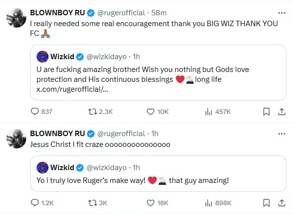 In response, Wizkid sent blessings, love, and protection to Ruger, calling him an amazing person. Ruger thanked Wizkid for the encouragement, saying it was just what he needed.